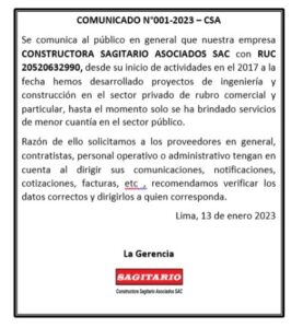 Comunicado N° 001-2023-CSA Ver imagen más grande Por sagit2|2023-03-21T11:23:29-05:00marzo 16th, 2023|Noticias| Share This Post With Others! FacebookTwitterLinkedInWhatsAppPinterestCorreo electrónico Artículos relacionados Aeropuerto de Chinchero estaría listo para operar en octubre del 2024 Galería Aeropuerto de Chinchero estaría listo para operar en octubre del 2024 febrero 26th, 2020 | Sin comentarios Beneficencia de Lima negocia 20 proyectos hoteleros, comerciales y culturales Galería Beneficencia de Lima negocia 20 proyectos hoteleros, comerciales y culturales febrero 26th, 2020 | Sin comentarios MTC: Más de 10 proyectos de transporte podrán adecuarse a normas ambientales en Pasco Galería MTC: Más de 10 proyectos de transporte podrán adecuarse a normas ambientales en Pasco febrero 26th, 2020 | Sin comentarios